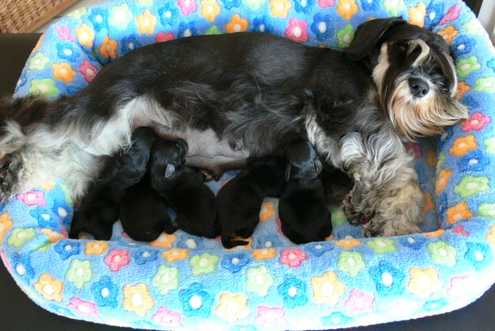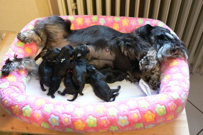 Beim ersten Welpen mußten wir beim Tierarzt etwas Geburtshilfe leisten, danach klappte alles super wir haben 3 Rüden und 2 Hündinnen.